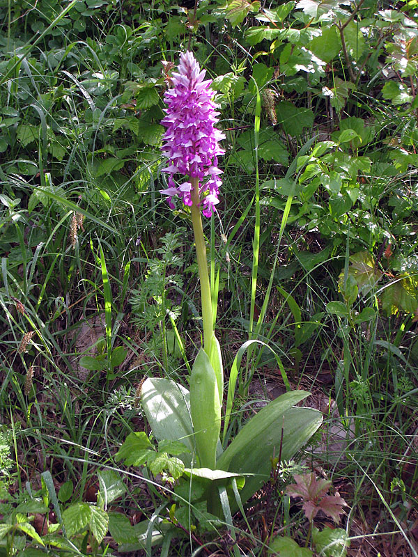 "Bild 5056 ist keine "reine" Orchis purpurea, sondern eine Hybride mit hohem purpurea-Anteil: dunkler Helm von purpurea, die schmale Lippe aber eher von militaris. Bei purpurea ist die Lippe viel breiter als bei militaris und eben auch breiter als bei dieser Hybride." Ein Foto der "echten" Orchis purpurea hier: