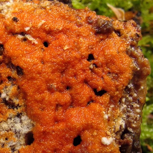 Spontan fällt mir dazu nur ne Hypocrea spec. ein. Für H. citrina käme der Pustelpilz aber sehr orange daher.