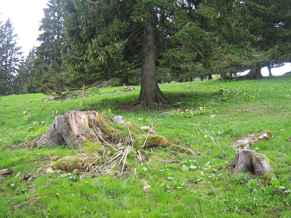Pfingstmontag, Berner Jura. Alte Baumstümpfe sind ein Blickfang.