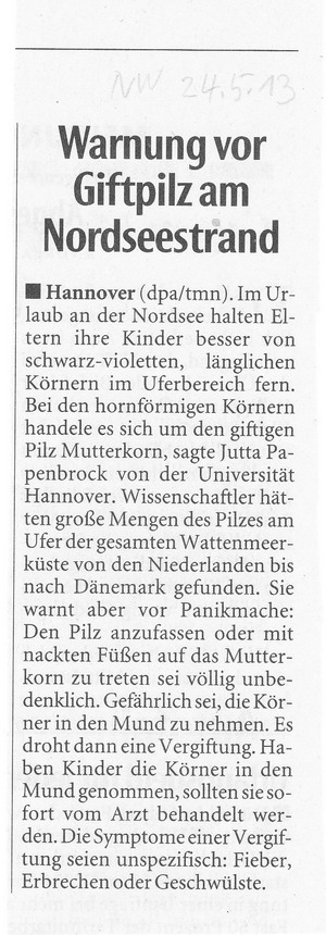 In der Presse wird die Nachricht verbreitet, dass "Wissenschaftler große Mengen des (Mutterkorn-)Pilzes am Ufer der gesamten Wattenmeerküste von den Niederlanden bis nach Dänemark gefunden" hätten.