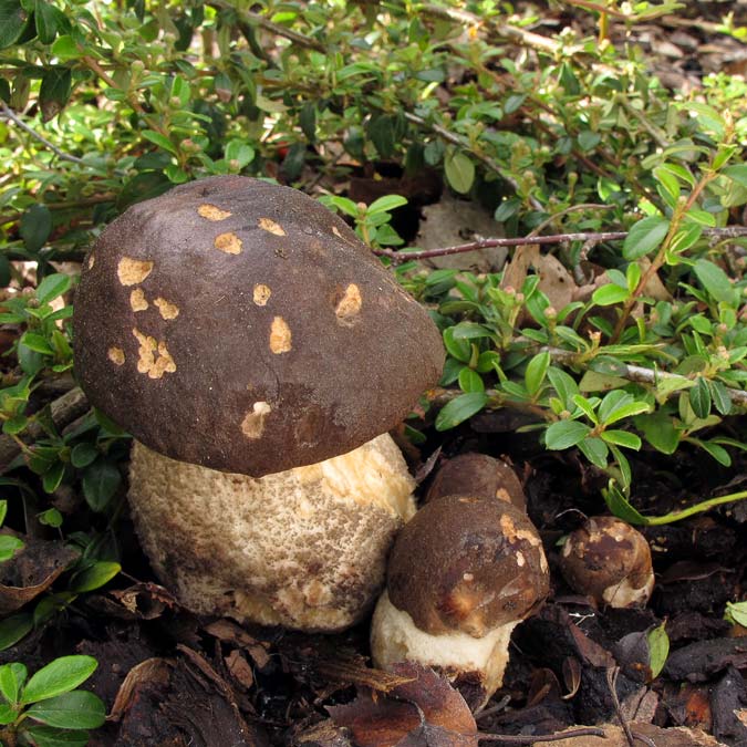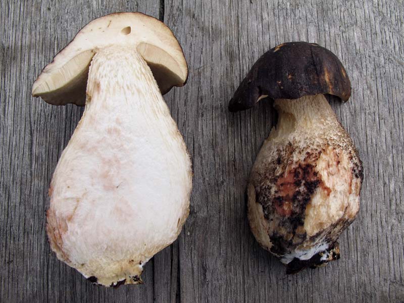 Auffällig war der stämmige robuste Wuchs, die sehr dunkle Hutfarbe und die rosa Verfärbung am Stiel und im Fleisch. Mit Fungi Europaei 2 lande ich bei L. roseofractum. Nach Den Bakker ist der in L. scabrum aufgegangen. Im IF gibts noch L. c. var. roseofractum als Eintrag. Ich würde das jetzt so verstehen, daß man dieses Taxon zumindest wieder in Varietätsrang führt. Oder liege ich da falsch?