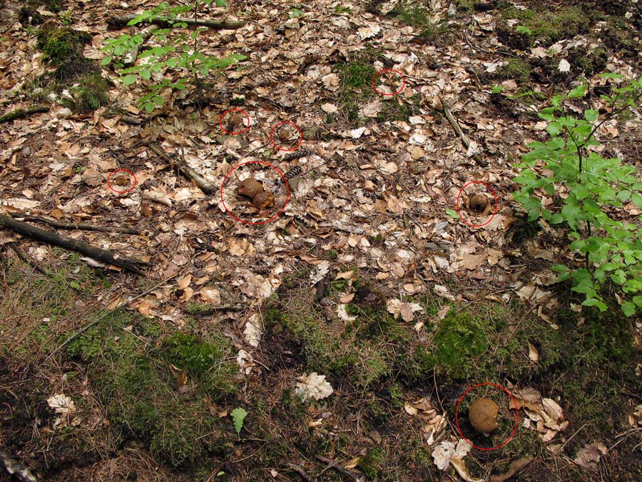 Alex hat zwar schön um die Ecke gedacht, lag mit seinen sieben aber trotzdem knapp daneben. Dem Wald-Pauli muss ich hellseherische Fähigkeit attestieren, denn rund 4m weiter auf der anderen Wegseite standen tatsächlich 10 Stück rum. Für vorliegendes Suchbild hats aber leider nix genutzt. :-) Sozusagen im Rücken der obeigen Aufnahme standen dann noch zwei alte Schlappen rum, an denen schon jemand genascht hatte.