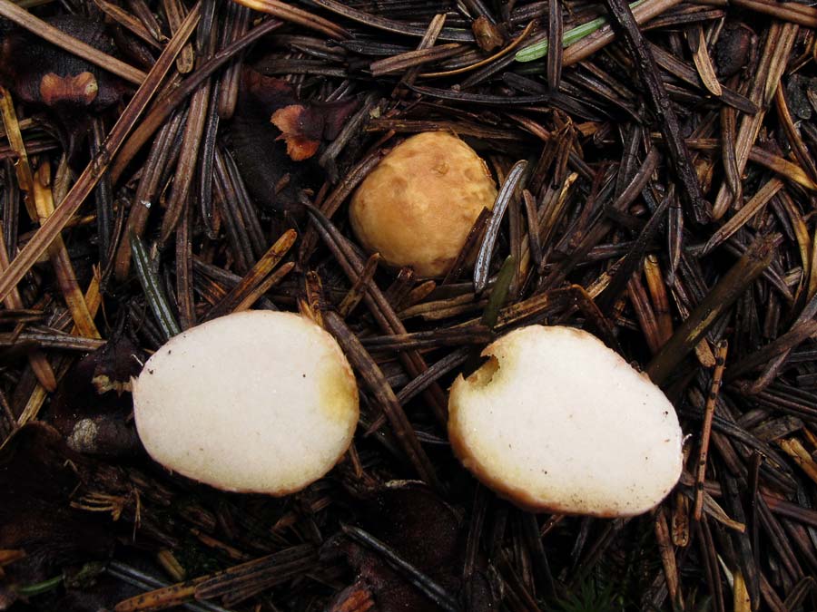 Leider nur ein mäßiges Schnittbild. Die weiße Glebafarbe des jungen Fruchtkörpers ist aber zu erkennen.