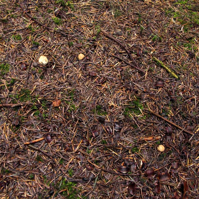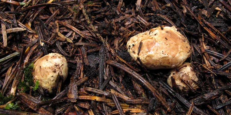 Der linke Fruchtkörper ist schon aus dem Boden gehebelt und zeigt die hellere Unterseite. Ansonsten wurde nichts verändert. Über dem rechten Exemplar sind noch weitere Fruchtkörper unter der Nadelstreu zu sehen / erahnen. Der Rechte und der in der Mitte habe ich zum aussporen am Standort belassen.
