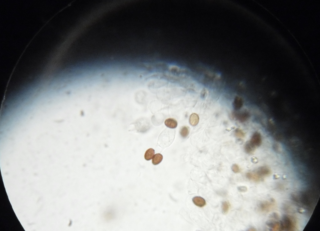 Hallo Andreas, ja, genau danach habe ich eigentlich gesucht. Oder zumindest danach, was nicht nach diesen Basidien aussieht. Was die Sporen + Basidien angeht schicke ich Dir mal ein Bild mit, was ich gemacht habe, indem ich einfach durchs Okular fotografiert habe. Daher die schlechte Qualität. Ich hoffe, man kann trotzdem etwas erkennen? Viele Grüße