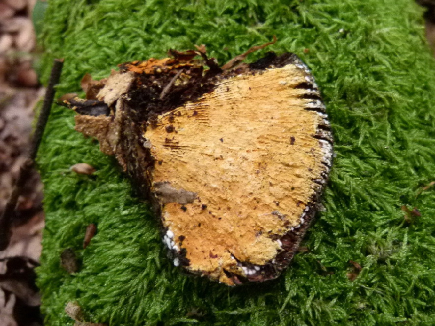 heute habe ich auf einem Laubbaum unter einer Daedaleopsis confragosa einen leuchtend orangen Pilz gefunden, der mir noch nie begegnet ist. Von der Konsistenz eher wie eine Corticiaceae und nicht wie ein Schimmel. Einfach septierte (Konidien-?)Sporen von 15x10µm.