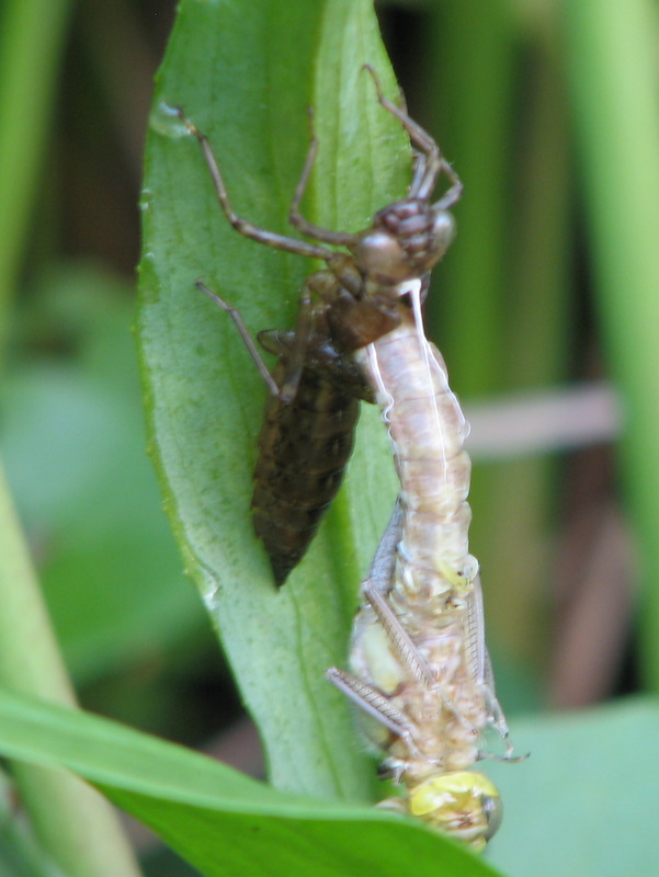 Hier auf dem (leider schlechten) Foto zu erkennen. Das wurde übrigens eine Blaugrüne Mosaikjungfer, die nach etwa 3 Stunden abflog.