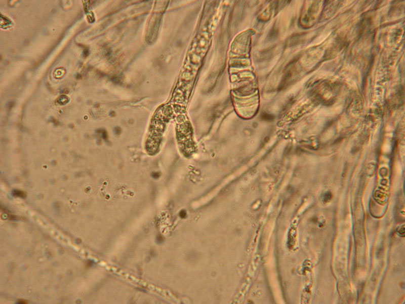 Das rechts neben der "Gabel" (Basidie?) dürfte eine relativ reife Spore sein (?).