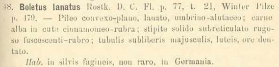 Diese Ansicht würde ich auch für äußerst problematisch halten. Siehe Saccardos (vollständige?) Wiedergabe der Originaldiagnose beigefügt - die würde recht klar auf die häufige Art, die wir heute Xerocomus ferrugineus nennen, hindeuten. Vielleicht bezieht sich Klofac auf das, was Singer unter Xerocomus lanatus verstanden hat - da müsste ich nochmal nachlesen. Aber es wird nur allzu gern vergessen, dass am Ende das entscheidend ist, was der ursprüngliche Autor und/oder der typisierende Autor eines Namens darunter verstanden hat, und dass es streng genommen völlig wurscht ist, was ein Autor, der den Namen umkombiniert hat, oder ggf. der sanktionierende Autor in der Originalbeschreibung zu erkennen meinte. Viele Grüße,