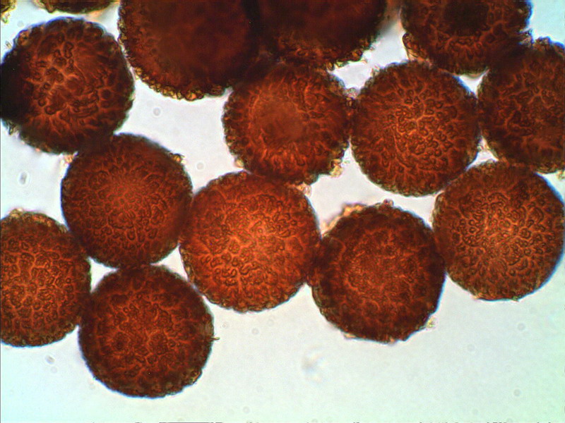 Hallo Andreas Da habe ich mich etwas auf Gunnar verlassen, der mir diese Hirschtrüffel zum Forumstreffen an einen nahen Standort zeigte. Er meinte, daß asperulus im Kramershai recht häufig ist. Makroskopisch sind diese trüben, weinbräunlichen Farben im Schnitt typisch. Mikroskopisch allerdings die etwas größeren Sporen, und das Ornament ist flacher als bei grannulatus. Ich selber übe noch, beide Arten sicher voneinander zu trennen, und in der Vergangenheit hießen alle dort gefundenen Hirschtrüffeln für mich auch Elaphomyces granulatus. LG Hartmut Sporen von Elaphomyces asperulus