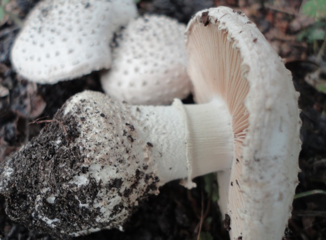 unterwegs meinte ich, Amanita strobiliformis gefunden zu haben. Zu Hause kamen mir Zweifel. Die Hüllreste sollten bei Amanita strobiliformis abwaschbar sein. Deshalb habe ich probeweise versucht, sie abzukratzen, was eigentlich gar nicht ging. Es sind eher so Schuppen, die sich nicht von der Huthaut ablösen lassen. Die verletzten Stellen röten. Auch die Lamellen haben einen leichten Rosaschimmer und frei sind sie nicht. Der Geruch ist unangenehm. Ich werde immer verwirrter. Wer kann helfen?