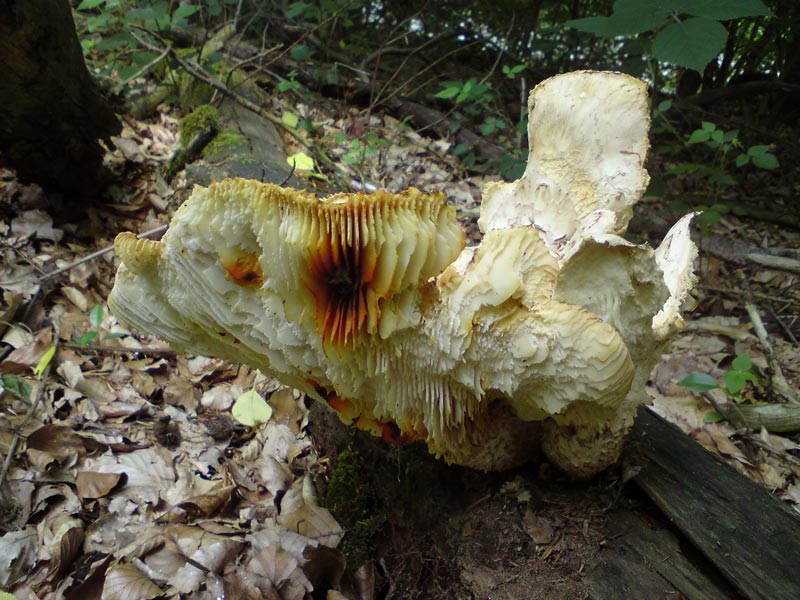 Hallo Bernd, ...Kann der auch gelb? ja das darf der nach meinen Beobachtungen. Bei Alten und durch Trockenheit gestressten Fruchtkörpern denke ich, ist das ganz normal. Selbst orange-rote Flecken, vorallem in den Lamellen, sind da nichts außergewöhnliches wie ich finde. Dein Fund ist ja nicht mehr der frischeste, also hatte ich mit der gelben Farbe kein Problem. Gruß Joschi