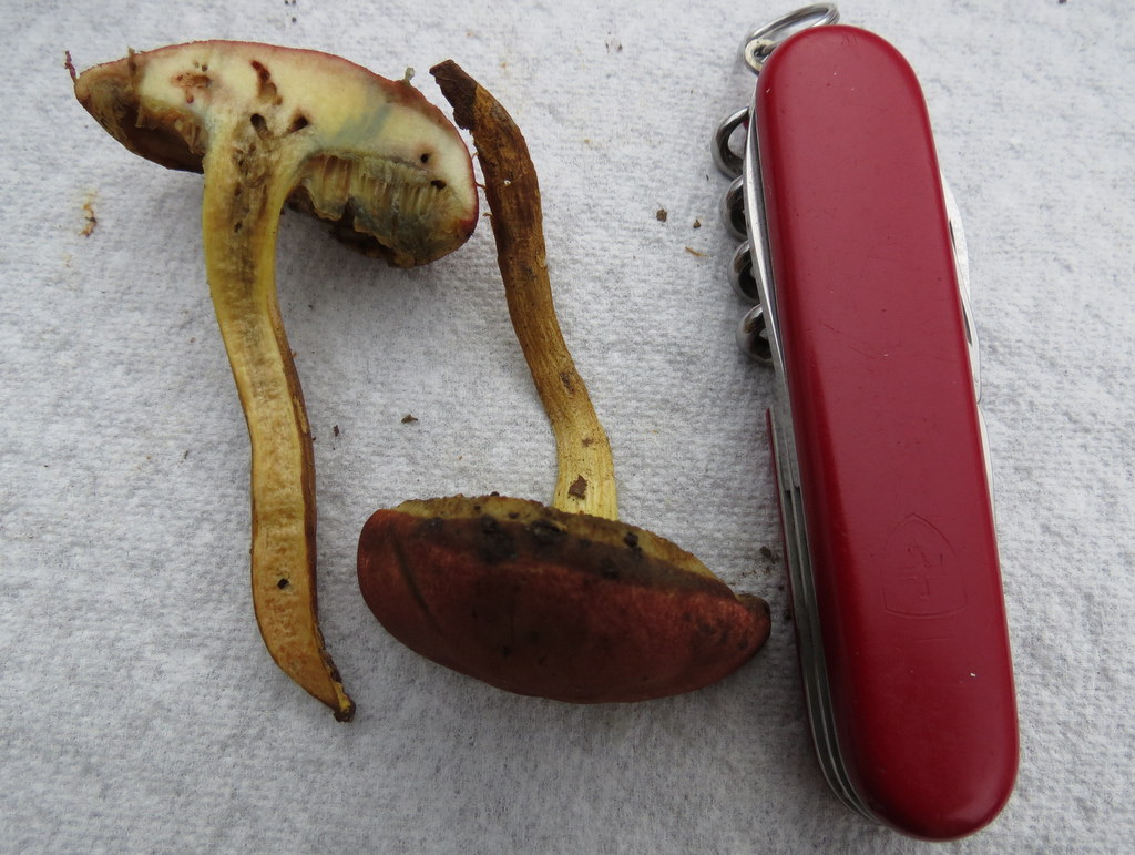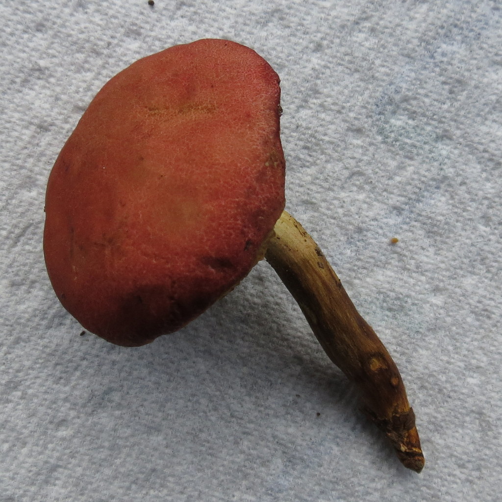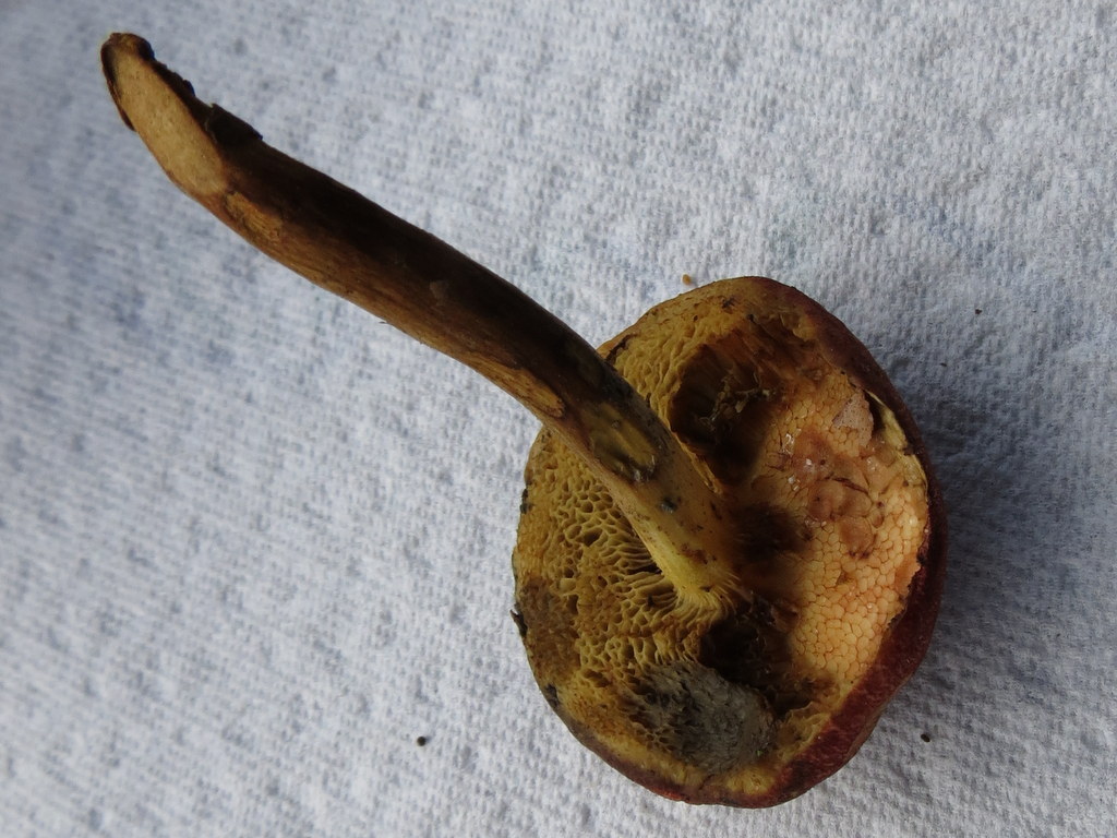 Nach der Beschreibung im Bon könnte das ein Aprikosenfarbiger Röhrling (Xerocomus armeniacus) sein und wäre eine Rarität. An einen Xerocomus rubellus können wir beide nicht so recht glauben.