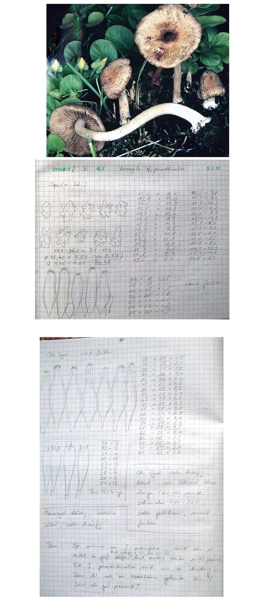 Hallo Gernot, ich habe einmal eine sehr ähnliche Inocybe von F. Wendland bekommen, die ich ebenfalls als cf. pseudohiulca bestimmt habe. Auch da waren die Sporen höckriger als in Lit. angegeben. Ich hatte diese Koll. an U. Luhmann weitergeleitet, er kam unabhängig zum selben Ergebnis. Da mir kaum Vergleichsmaterial vorliegt, ist es schwierig die Variabilität abzuschätzen. Außerdem wäre ein Vergleich mit dem Original von Nöten. Ich hänge mal ein Dia-Repro und Mikroskizzen mit an. Gruß Andreas : Inocybe sp. 1 (Risspilz) : Erstes schnelles Blättern in der entsprechenden Literatur hat mich noch nicht
