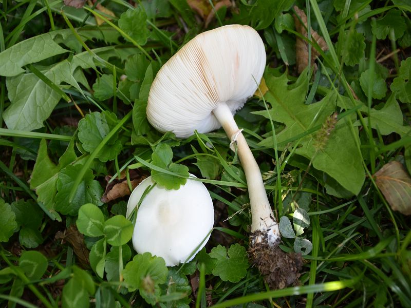 Ein kräftiger Pilz mit weißen Lammellen in der Wiese.