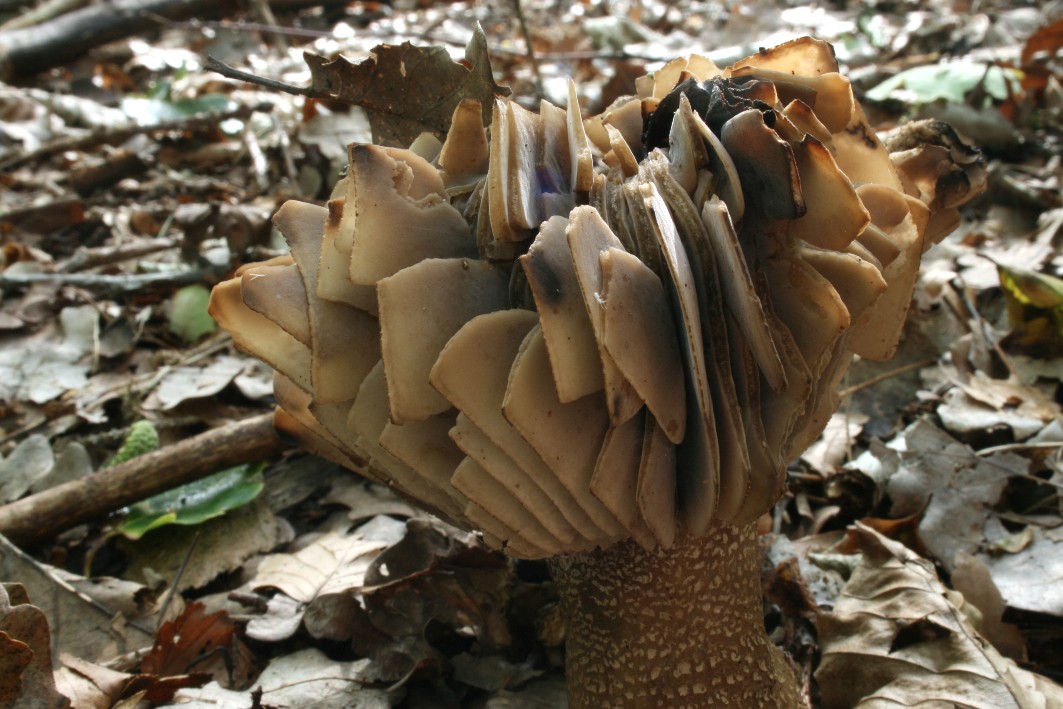 Hallo Werner, danke fürs Mitmachen! Gell, das Rätsel war zu einfach?! Es handelte sich einen ganzen Trupp Dickblättriger Schwärz-Täublinge (Russula nigricans), deren Lamellen nach oben gereckt, regelrecht zersplittert waren. Das sah sehr bizarr aus. Man beachte auch die seltsame Struktur der Stiel-Oberfläche - so ist der in keinem Pilzbuch beschrieben! Weiß jemand auch noch eine Erklärung dafür?