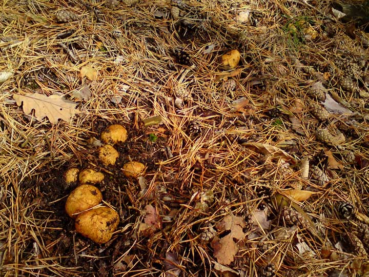 die Gelbliche Wurzeltrüffel R. obtextus / luteolus finde ich bei uns recht häufig. Als unterirdisch würde ich die nicht bezeichnen wollen. Wenn die Streudicke es zuläßt ist die auch ohne zu kratzen sofort zu entdecken. Im Alter wird das Innere übrigens flüssig und stinkt erbärmlich nach Jauche. Ich hänge Dir mal ein altes Handy Foto an.