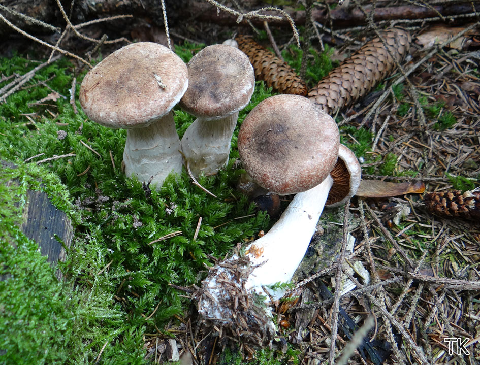 Hallo zusammen, am Wochenende habe ich einen Schleierling fotografiert, der leider unbestimmt bleiben musste. Wuchsort war ein bodensaurer Fichtenforst im Siegerland. Das Fleisch verfärbte sich nicht, sondern blieb weißlich. Die Reaktion mit KOH war grau. Die Sporen waren länglich und mit 12 mü relativ groß. Ein Geruch war vorhanden, aber schlecht zu beschreiben. Die Pilze waren zudem sehr trocken. Vielleicht kennt ja jemand die Art?