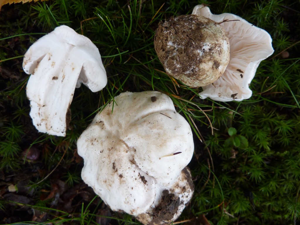 Hallo, dieser festfleischige, weiße Ritterling sieht mir sehr nach Tricholoma columbetta aus. Standort bei jungen Eichen im Moos, in der Nähe auch Buche, Birke und eine alte Linde. Auffallend die Farbe, das feste Fleisch von Hut und Stiel, der stark gewellte, eingerollte,lappige Hutrand,die breiten, teils sehr eng stehenden Lamellen und der starke, relativ kurze Stiel. Weißes Fleisch mit deutlichen schwer definierbaren Geruch. Weiterhin kleine,blaugrünfleckige Flecken an der Stielbasis. Danke für die Mithilfe. Jochem