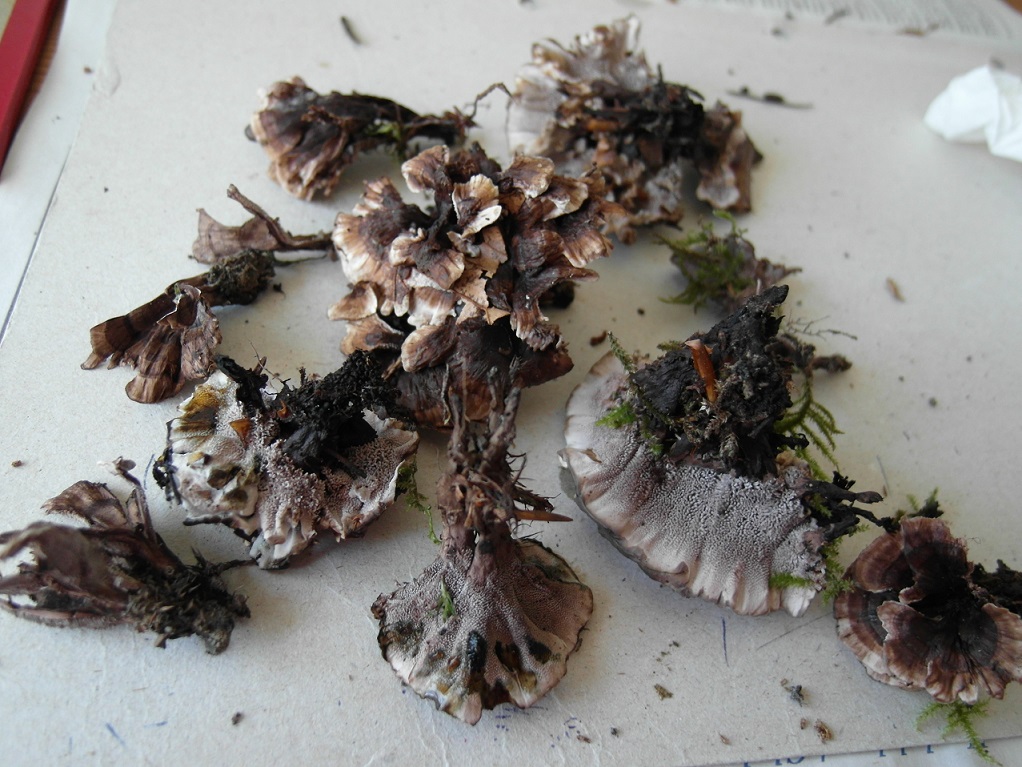Hallo! Ich muss gestehen, dass ich mir nicht mal mit der Gattung Phellodon sicher bin. Jedoch habe ich einen schwachen Maggi-Geruch wahrgenommen, daher bin ich dann auf Phellodon gekommen. Mit Hilfe eines tschechischen Schlüssels kam auf P. connatus. Dazu würde auch die +/- grüne KOH-Reaktion auf den Fruchtkörpern passen. Der grösste Hutdurchmesser war 5.5 cm, die meisten waren jedoch deutlich kleiner.