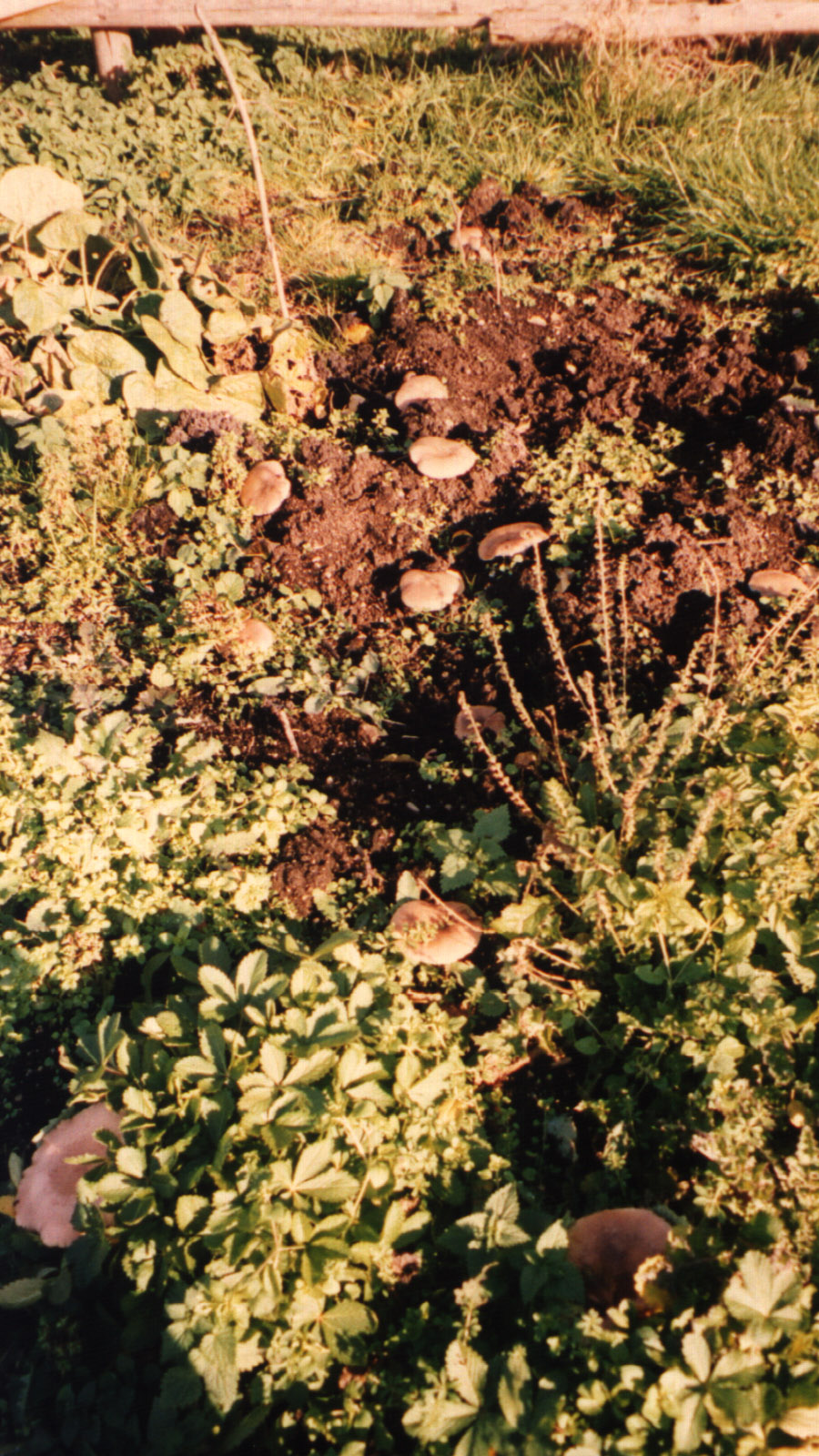 Hallo Gabor, hier das Bild vom Wuchsort, ein ziemlich verwildertes ;-) "Hochbeet", das nur aus altem verrotetem Pferdemist besteht (hier im Lechfeld haben wir so gut wie keinen Humus zwischen den Lechkieseln). Einen Monat vorher hatte ich Kartoffeln aus diesem Beet ausgebuddelt. Anscheinend mochte das Mycel diese Umgrabeaktion. herzliche Grüße Birgit