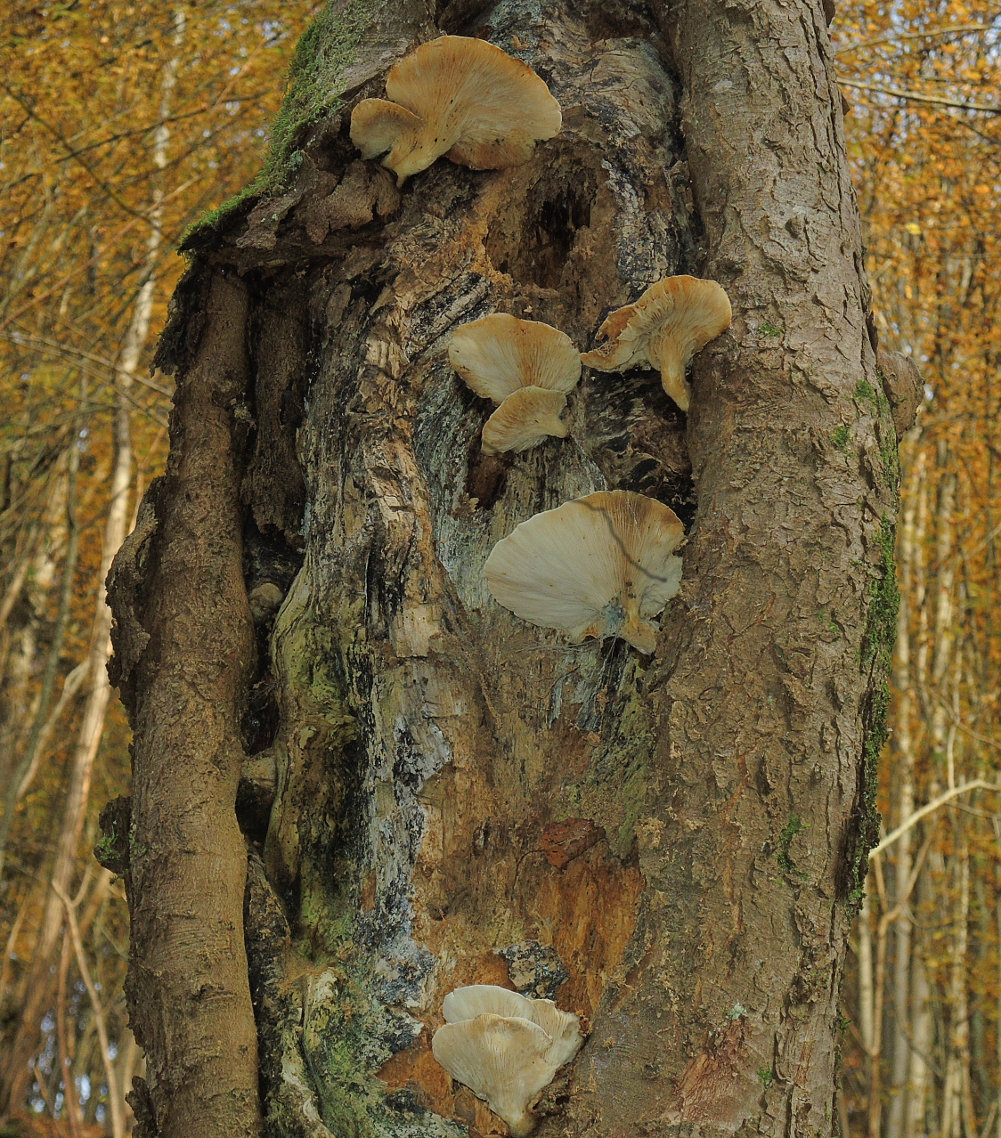 Fund von gestern, an der Gaißa 10km nördlich der Donau in Niederbayern, boden- und luftfeuchter Standort im schluchtartig eingeschnittenen Flußtal. Vermutlich Weide, bin mir aber nicht sicher, standen außerdem Zitterpappeln, Birken, Pappeln, Erlen und Fichten daneben. Saurer Boden (Bayerwald-Urgestein mit lokalen Quarzadern, also kalkigen Bereichen - Nebenpfahl) Das Foto ist leider unzulänglich, die Wunde, in der die Pilze wuchsen, war 4 Meter über dem Boden und ich konnte nur das kleine untere Exemplar mit einem Ast herunterholen, sieht etwas angeschlagen aus, evtl. fotografier ich es morgen noch mal bei Tageslicht aus der Nähe. Vielleicht reicht aber auch die Beschreibung: Einer der auffälligsten Pilzgerüche ever: frisch schon intensivst nach sauren Fruchtbonbons (Anis finde ich nicht treffend, Anisgeruch kann ich bei anderen Arten gut identifizieren), einen Tag später erinnert mich der Geruch an einen sehr süßen Fruchtlikör aus Orangen und Kirschen, eine leicht vergorene Komponente ist hinzugekommen. Die Oberseite des Hutes ist feinstreuselig bis schuppig, cremefarben bis blaß bräunlich, Hutrand heller und schmal nach oben aufgerollt, Schüppchen zur Hutmitte dunkler, aber winzig.