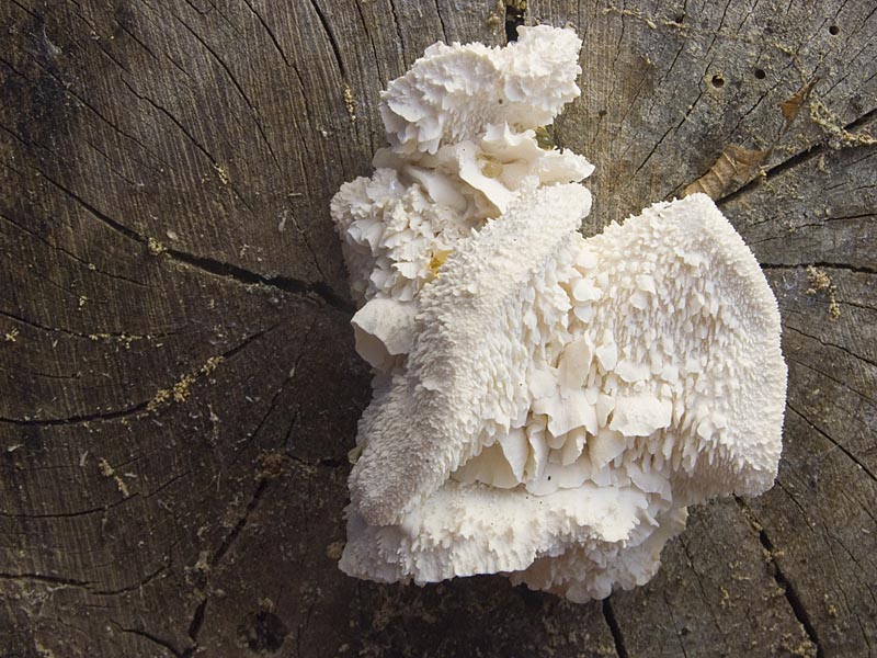 Ganz so leicht scheints ja doch nicht gewesen zu sein, ich dachte das Äußere dieses Pilzes wäre charakteristisch genug. Ich bin aber selbst bei solchen Rätseln immer ziemlich schlecht. Es handelt sich um den dornigen Stachelbart (Creolophus cirrhatus), das hat ck und Rudi vermutlich auch richtig erraten. Schnuffel könnte nun den Spiess umdrehen und mich raten lassen, was wohl S.c. ist (Sparrassis crispa?). C.c. wächst hier an der Stirnseite eines ca. 2 m langen und ca. 45 cm dicken Buchenstammstücks. Die tote Buche wurde in Stammstücke geteilt und dort liegengelassen, auf einem Nachbarstück wächst der ästige Stachelbart (Hericium coralloides). Ich habe für unsere Gegend den Eindruck, dass der dornige Stachelbart seltener ist, als der ästige oder zumindestens weniger häufig fruktifizert. Außerdem finde ich den dornigen Stachelbart einfach wunderschön und habe mich sehr gefreut ihn wiederzufinden. liebe Grüße Birgit