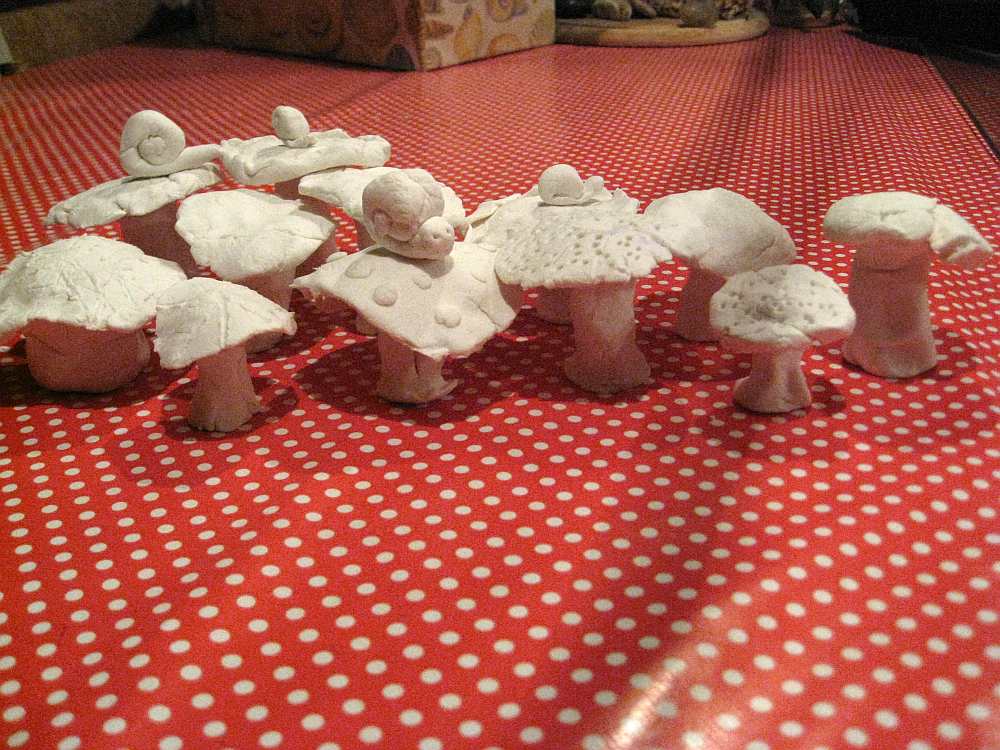 Hallo zusammen, am Wochenende hatte ich wieder 2 meiner Enkel bei mir. Der Vormittag reichte um mit Körbchen, Messern (besonders spannend) und Kamera in den Wald zu fahren. Bis zum Regen hatten wir leider nur 2 Stunden Zeit. Für die Kinder ist es immer Abenteuer pur - bunte Blätter, Bäume mit Gesichtern suchen, Pilze sammeln und bestaunen, Picknick. Für den Nachmittag hatten wir Modelliermasse und siehe da, die Kinder waren inspiriert und fingen an Schnecken und Pilze zu formen. Ich holte 2 Pilzbücher als Vorlage und es entstanden Pilze, deren Namen sie kaum lesen konnten. Wir hatten damit fast 4 Stunden Spaß. Natürlich musste ich mitmachen. Wenn die Masse trocken ist, sollen die Pilze bemalt werden und mit Holz, Moos und Kerzen zu Gestecken werden. Wir freuen uns schon drauf. Liebe Grüße Kirsten