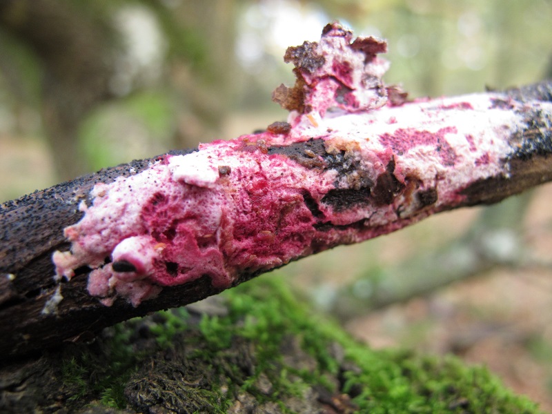 Ich habe einen wunderschön pink-rosa-lila Pilz gefunden, dem ich einen Namen geben möchte. Auf liegendem angemodertem Eichenast. Das Einzige, was ich in dieser Farbe gefunden habe, wäre Hypochnella violacea. Das kann ich aber kaum glauben.