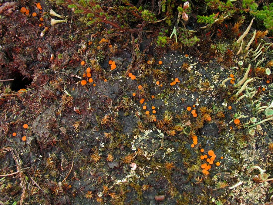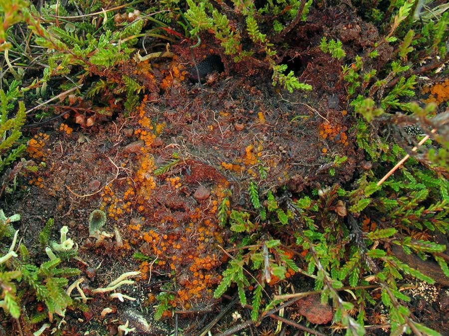Standort auf Urinstelle zwischen Polytrichum Moos. Reste von alten Kötteln waren auch noch vorhanden. Das Loch links ist die Höhle eines Stierkäfers.