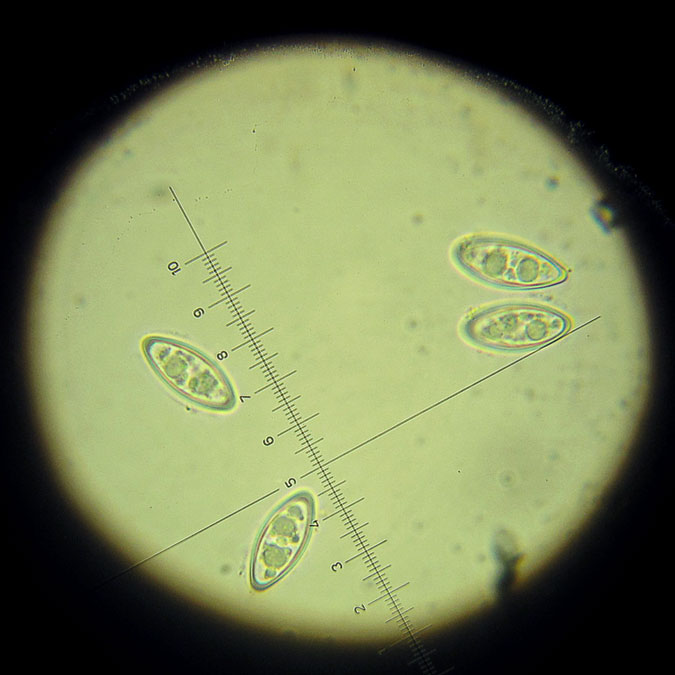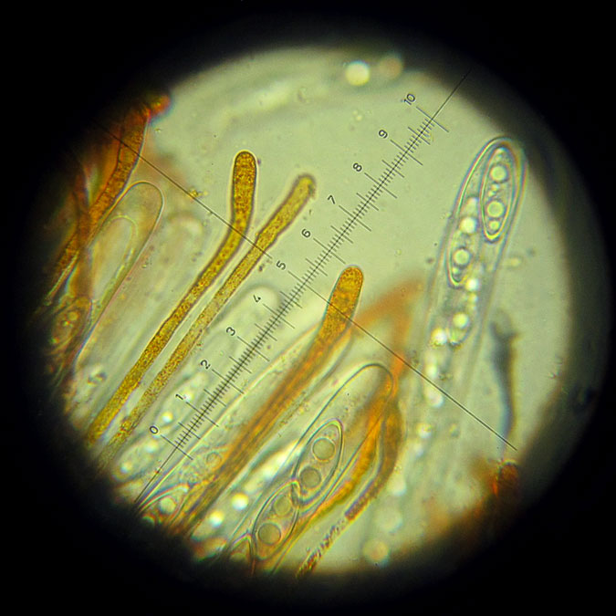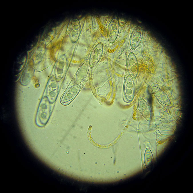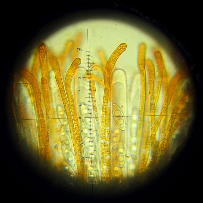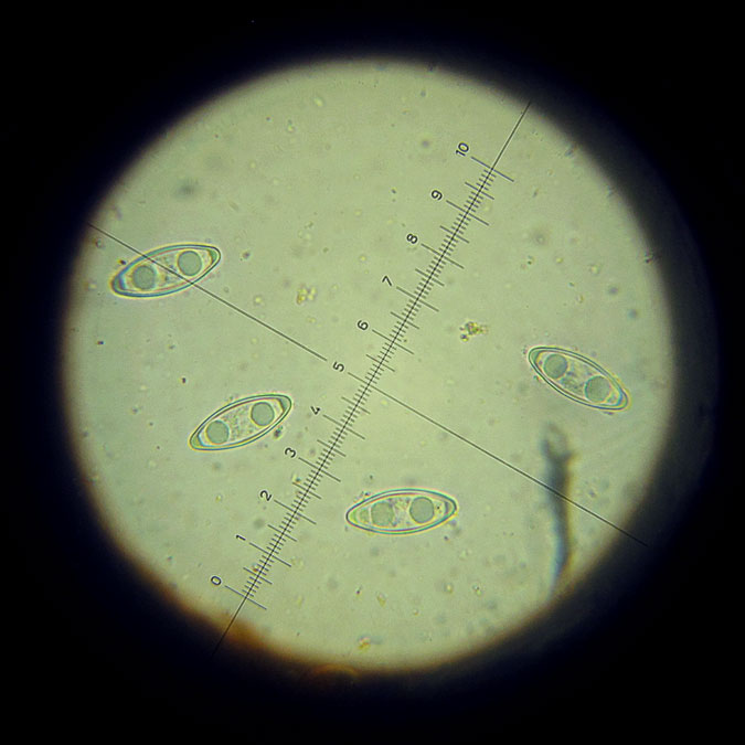 Sporen etwa 23x9 µm. Auffallender finde ich jedoch die 2 Öltrpofen, die meist alleine im Inneren zu beobachten sind. Die Sporenwandverdickung an den Polen fällt meist auch deutlicher aus.