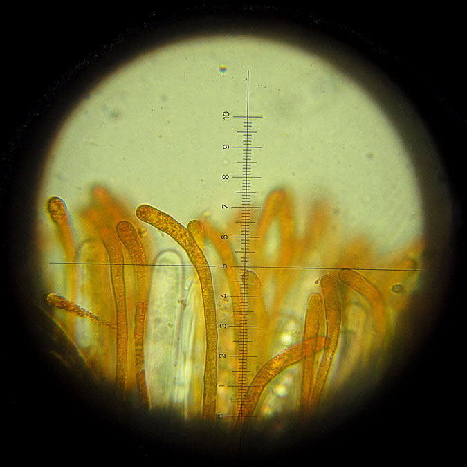 Die Parapysen sind am Ende etwas keulig verdickt und wirken eher abgeknickt als gleichmäßig gebogen. Zudem haben sie eine recht uneben-wellige Oberfläche über die gesamte Länge der Paraphyse. Sie erinnern irgendwie an verbeulte abgenutzte Eishockeyschläger. Sie sind auch meist durch und durch orangerot gefärbt, nicht nur im Bereich der "Kügelchen" im Inneren.