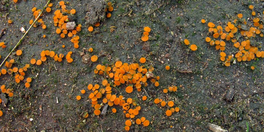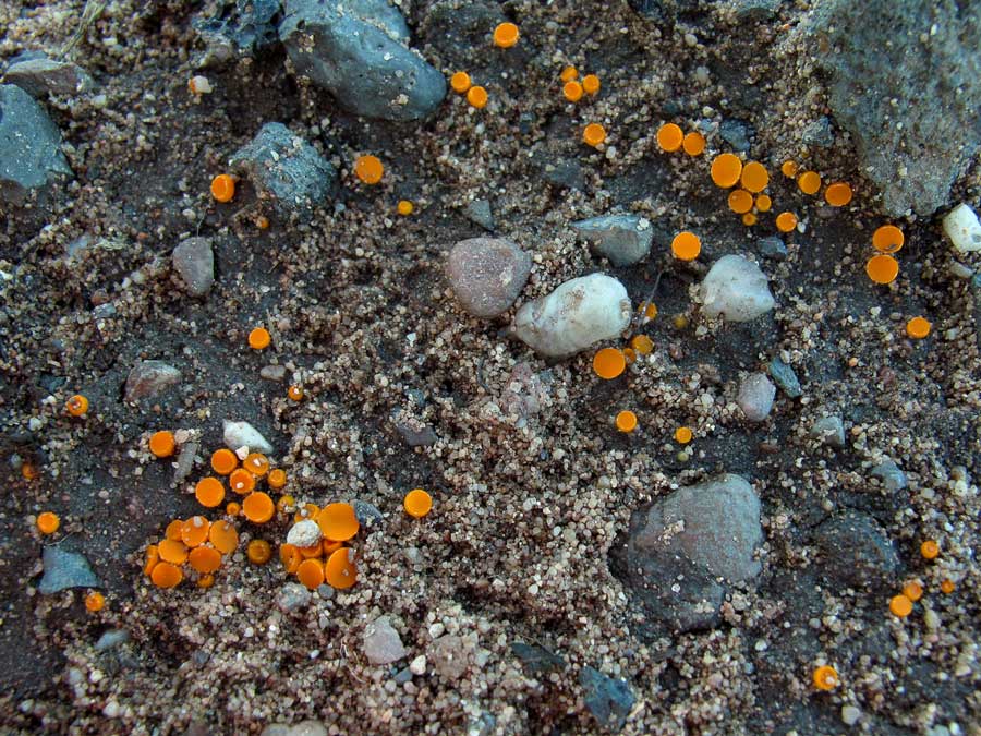 Das Foto ist leider immer noch viel zu Rot. Hab erst jetzt kappiert, daß mir meine rote Jacke bei praller Sonne den Weißabgleich nahezu unmöglich macht! :-( Sandort auf Urinstelle auf Moos und anderen Pflanzenteilen, sowie auf dem Aushub eines Stierkäfers. Alte Köttel lagen auch hier in der Nähe. Die Becher sind deutlich kleiner und in natura auch deutlich gelber. Wobei diese Kollektion bisher die "rötest" war. Ich denke die waren schon sehr reif bis überreif, da ich im ersten Präparat eines großen Fruchtkörpers fast nur noch leere Schläuche gefunden habe.