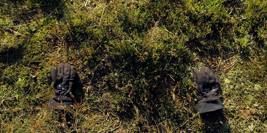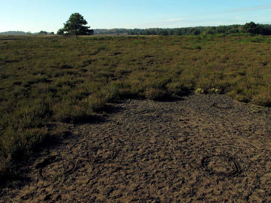 Ein Standort von vielen auf Schafwechsel und / oder alter Fahrspur zwischen etwa 40cm hohem Heidekraut. An diesen Stellen fanden sich bei weitem die größten Populationen. Hier waren wieder alte Köttel, in diesem Fall vom Regen schon zu einer dünnen Schicht zerlaufen, und teilweise auch die Stierkäferhöhlen zu finden. Mein Fazit zur Ökolgie bisher: Beide kommen auf Urinstellen und/oder bei Kötteln vor.