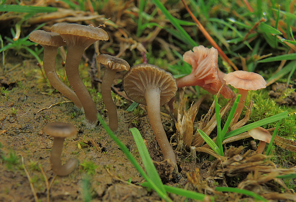 Hallo zusammen, Die beiden kleinen Familien wuchsen in enger Nachbarschaft oben auf einer mageren Gartenböschung. Daneben und unterhalb rasierter, aber krautreicher Rasen, oberhalb Acker. Vor 3 Tagen. 350m N.N. Hutdurchmesser der Erwachsenen ist so ca 10 (-15)mm gewesen. Die Überschrift deutet meinen derzeitigen Stand bei der Bestimmung an, es könnte aber beides auch was anderes sein. Es würde mich freuen, wenn Ihr ratet, sowohl worauf ich angespielt habe wie auch welche Arten es in Euren Augen wirklich sein könnten. Und evtl mir ratet, was ich tun könnte, um die cf's zu tilgen lg