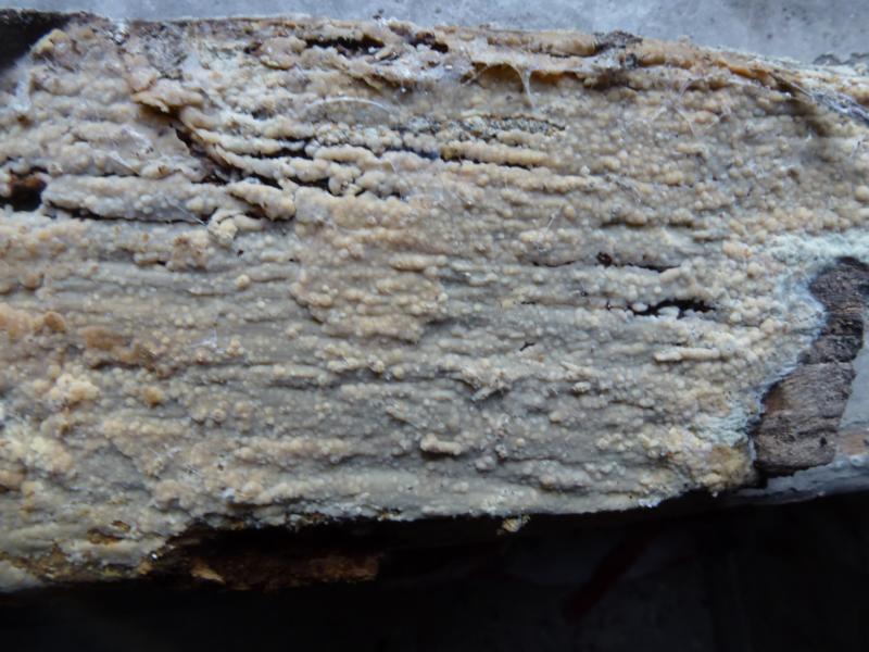 An Rindenpilzen kann man ne ganze Menge finden. Man muss nur immer schauen, dass man nicht auf einer ähnlich faulen Diele steht. Deshalb ernte ich meine Beute meist von der Decke über mir, also in luftiger Altbauhöhe von 3,60 m über meinem Standort. Hier im konkreten Fall stammt alles Gezeigte von der Zimmerdecke der 4. Etage. Die anderen Etagen, wo es ähnliche und weitere andere Funde geben wird, sind erst nächste Woche dran.