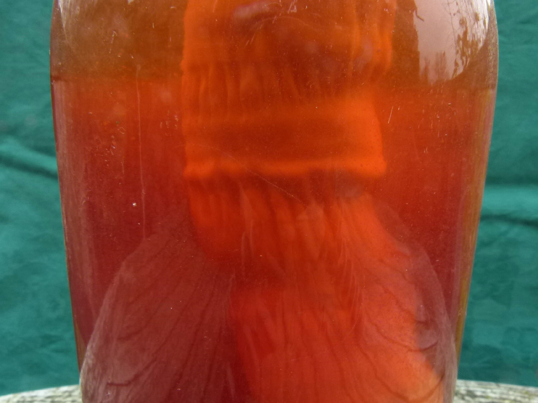 mir ist ein sehr merkwürdiges Ding untergekommen, zu dem ich gerne Eure Meinung hätte. Eine Bekannte hat mir eine Flasche gegeben, in der in einer rötlichen Flüssigkeit ein dicker, ingwerwurzelähnlicher Knüppel schwimmt, der sehr viel dicker ist als die Öffnung der Flasche. Nach Aussage der Bekannten war in der Flache ursprünglich nur Schlehensaft ohne jeglichen Zusätze. Die Flasche steht seit etwa 12 Jahren im Keller, zusammen mit mehreren anderen, die ebenfalls ähnliche Phänomene zeigen, nur teilweise ganz anders geformt z.B. in getrennten Scheiben. Ich dachte am Anfang an etwas wie Essigmutter, habe die mit einem Gummipfropfen verschlossene Flasche geöffnet und vorsichtig dran geschnuppert. Die Flüssigkeit ist praktisch geruchlos, jedenfalls ohne Essiggeruch.