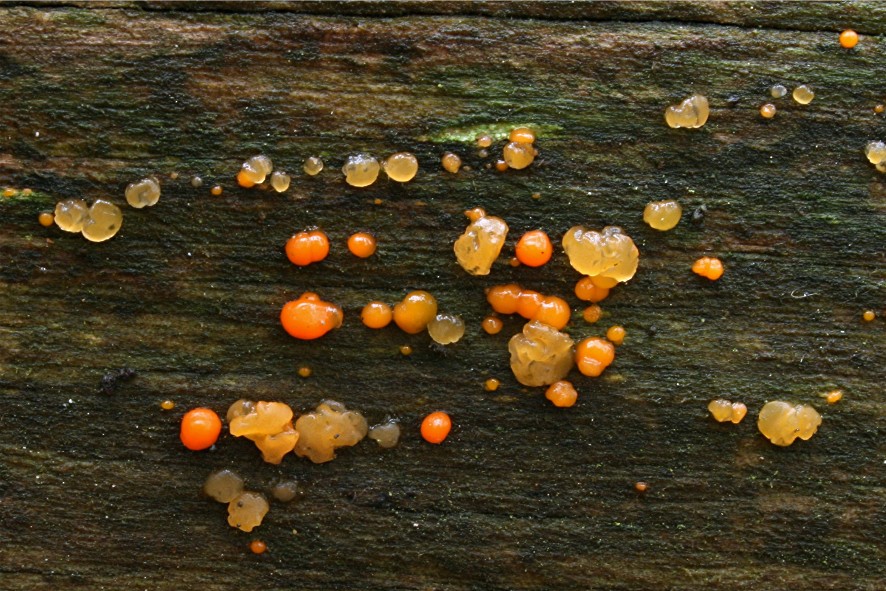 Hallo Thomas! Ein Myxo ist das mit Sicherheit nicht - die hätten sich schon lange vereinigt und würden nicht in kleinen Einzelgruppen rumspazieren. An diesen Schleimfluss glaube ich auch nicht - keine Verletzung (wie Du ja auch schreibst), in dieser Jahreszeit geringer Saftfluss. Ich möchte mich an Gábors Meinung anschließen und auch die Zerfließende Gallertträne favoritisieren. Anbei ein Foto mit verschiedenen "Zuständen" von Dacrymyces stillatus - lass da mal ein bisschen Frost drübergehen, dann kämen Deine Bilder schon hin. Viele Grüße - Rika