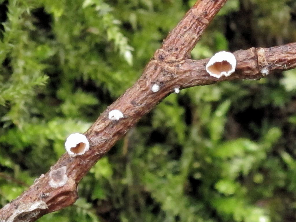 Größe ca. 2,5 mm hoch und 2 mm breit, Außenseite wollig, weiß, Hymenium