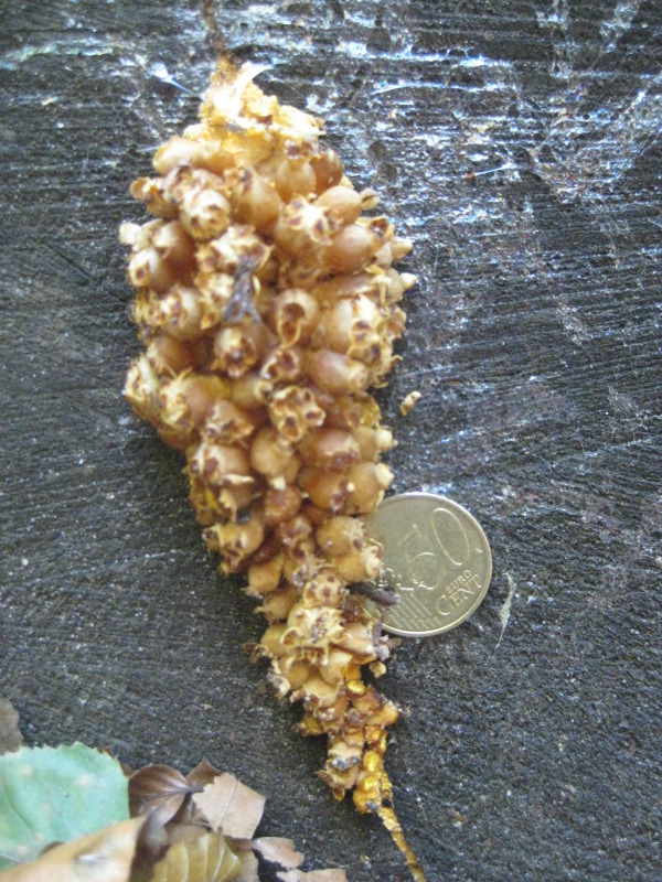 Funddaten: Oktober 2013, Elbsandsteingebirge, Buchenwald auf Sandstein Am Anschnitt einer gefällten Buche Bisher habe ich Pilzkundler, Insektenkundler und Förster gefragt, und niemand wusste, was es ist.