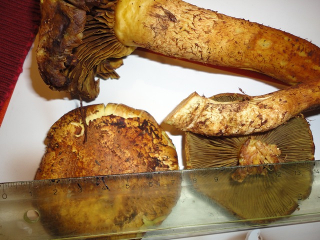 Bei den Pilzen dachte ich an Pappelschüpplinge, aber dafür sind mir die Schuppen nicht fransig genug. Für sparrige Schüpplinge wiederum nicht sparrig genug. Aber das mag am Alter liegen. Die Sporen sind etwa 6-7 x 4-5.