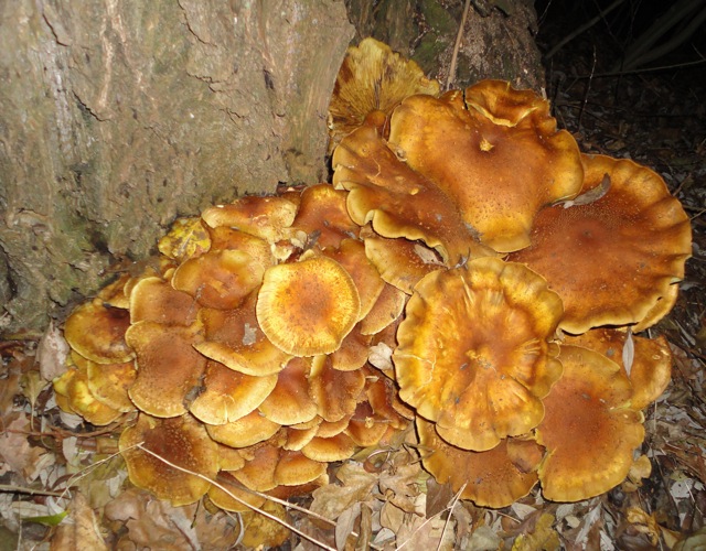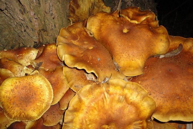Vorgestern sah ich ein Büschel Pilze am Wegesrand, hatte aber keine Kamera dabei. Gestern kam ich nun wieder da vorbei, diesmal mit Kamera, aber im Dunkeln. Hier eine kleine Foto-Auswahl mitsamt Baum, ich dachte erst an Pappel, dann an Weide.