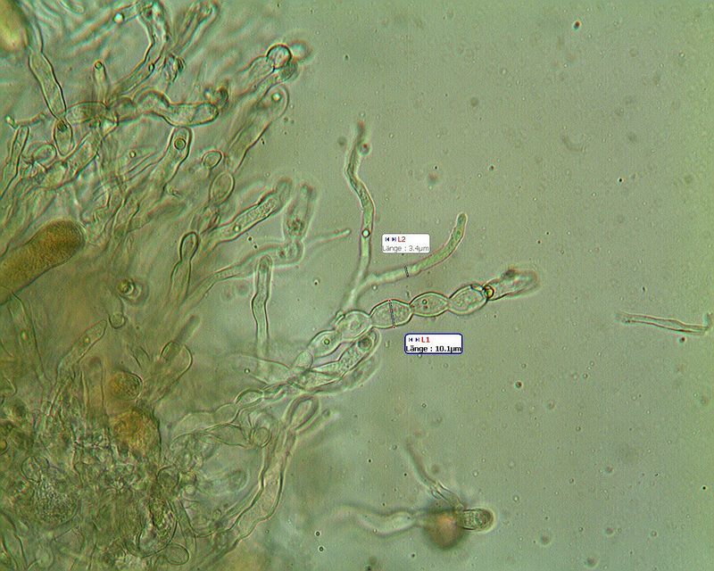 Im Gewebe sind keulenförmige, mit braunem Granulat gefüllte Gebilde (Länge ca. 110µm), mehrfach septierte Teile (Durchmesser 10µm) und verzweigte Elemente (Durchmesser 3,5µm)(Bild 3)