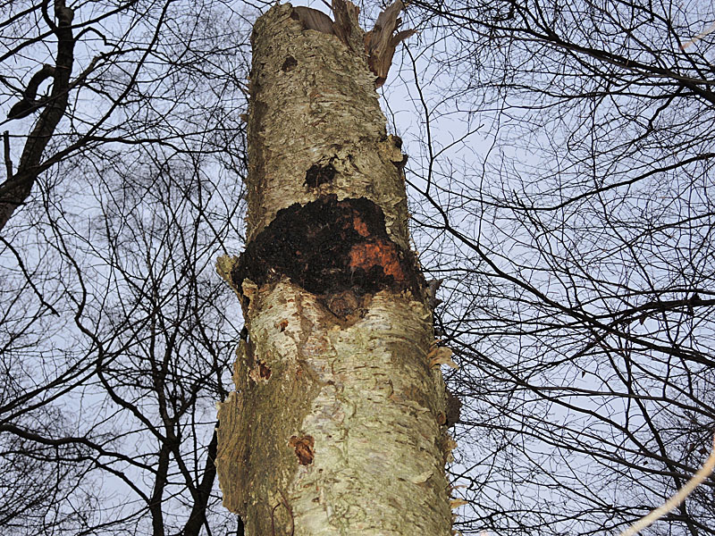 So stelle ich mir "Chaga" vor (Inonotus obliquus, bzw. dessen Mycel) - das dürfte hinkommen, oder? Komisch, dass ich da vorher nie so drauf geachtet habe. Hier hatten das etliche Birken, für nähere Aufnahmen hätte ich allerdings eine Leiter gebraucht.