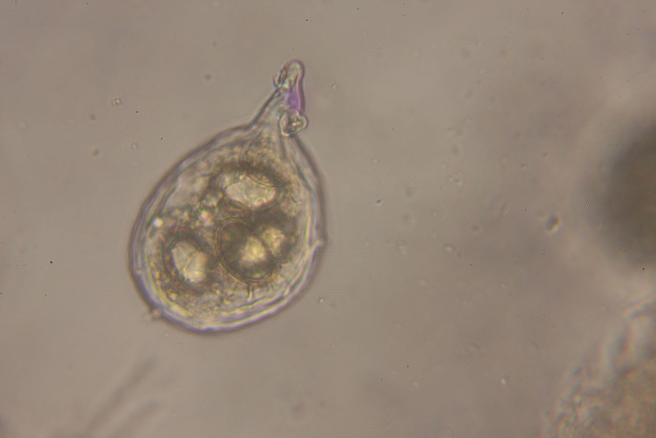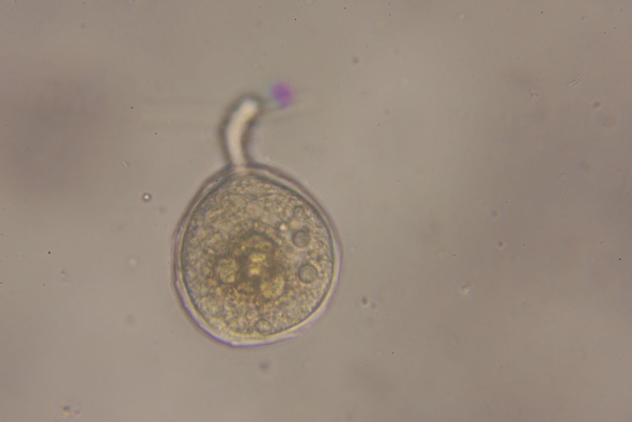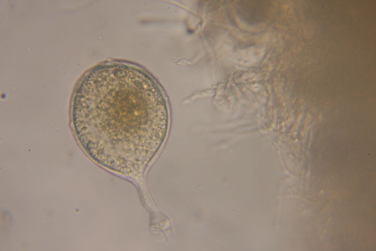 Heute habe ich das Präparat, das ich mit Nagellack versiegelt habe, nochmals angeschaut. Die Asci (die netterweise aus dem viel zu dicken Querschnitt ausgewandert sind) zeigten alle seltsame Auswüchse, als würden sie keimen:
