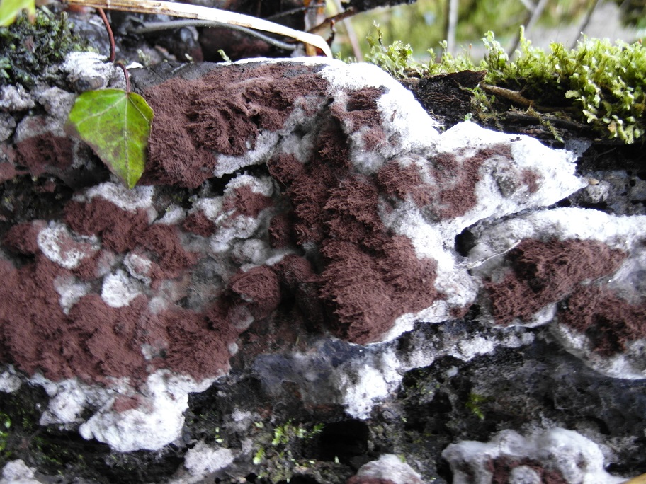 Hallo Diese grossflächigen, pulverigen Beläge habe ich in letzter Zeit recht häufig auf Totholz gefunden. Ich frabe mich, ob das ein Schleimpilz sein kann? Die Schicht war mehrere Zentimeter dick und zerfiel sofort bei Berührung in eine staubige Masse. Anscheinend wurde sie nun noch von einem anderen Pilz befallen (der weisse Belag). Gruss Jonas