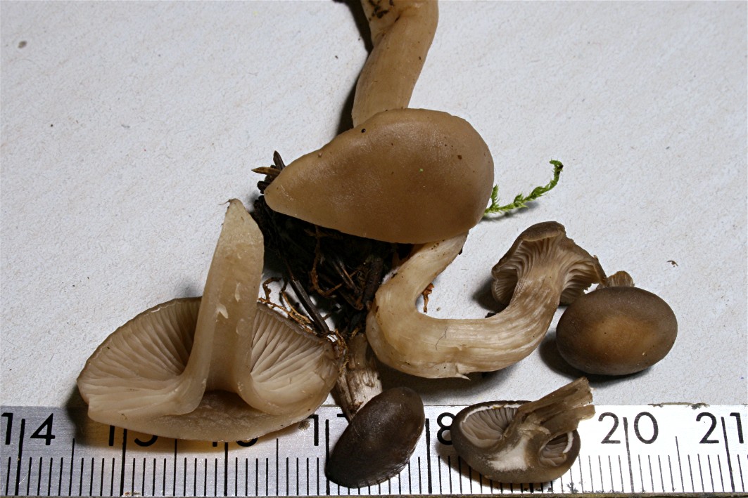 Hallo Richard, Thomas und alle Mitleser! Danke an die beiden Erstgenannten, dass wenigstens Ihr Euch getraut habt einen Tipp abzugeben! Aber diese Pilzchen sind irgendwie vertrackt. An einen Horngrauen/Butter-Rübling glaube ich nicht, dafür sind die Lamellen zu dunkel, und dann dürfte er nicht so ekelhaft schmecken. Heute war ich nochmal an den zwei Standorten, habe je 2 Frk. mitgenommen (bevor nun strengerer Frost kommt) und 3 Winzlinge stehenlassen. Die 2 links im ersten Bild meines Beitrags* sind gewachsen und sehen jetzt eher nach Clitocybe aus. Ich schwanke derzeit zwischen Trichterling und Rasling. Bei Lyophyllum komme ich beim Schlüsseln nach GroPiBaWü (Bd. 3, S. 308) bei L. tenebrosum raus - das wäre aber äußerst unwahrscheinlich. Jetzt habe ich jedenfalls wieder Frischmaterial fürs Mikro und werde nachher mal Trama und Cutis anschauen - vielleicht bringt mich das weiter? Anbei ein Gruppenbild der heutigen Aufsammlung, die beiden Größeren sind die vom ersten Bild* (der Große im Schnitt und der mit dem krummen Stiel). Über weitere Anregungen wäre ich dankbar! Viele Grüße - Rika