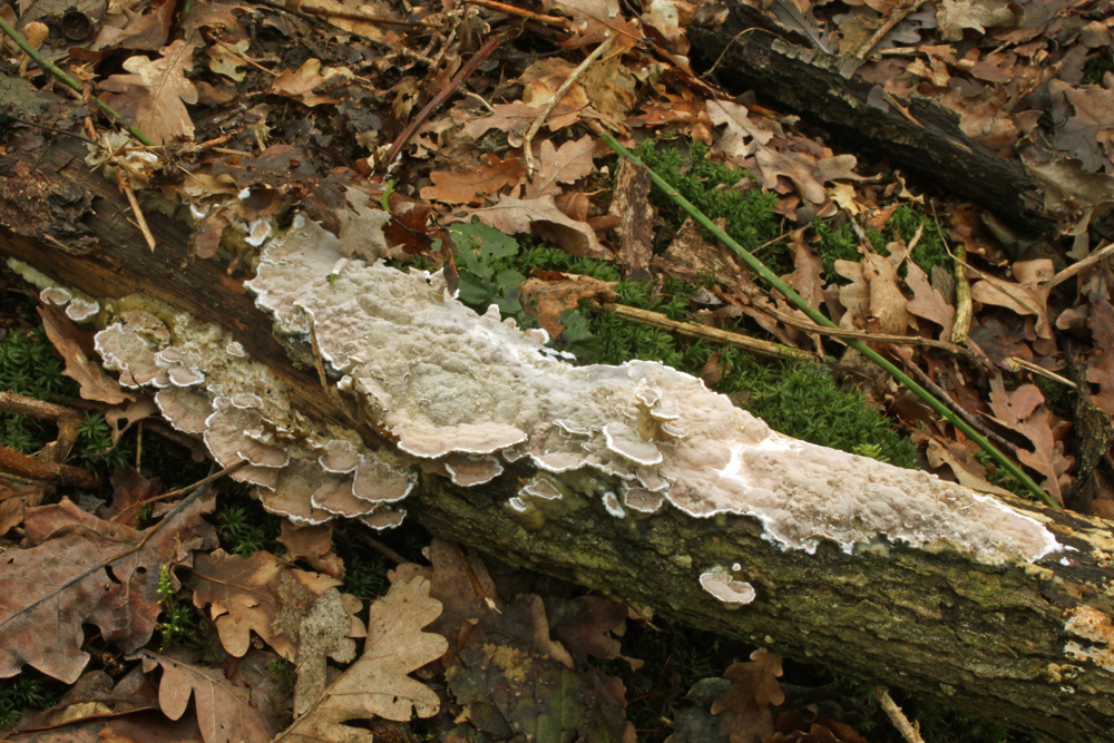 Diesen Porling - ich denke mal an den Zweifarbigen Porling - fand ich am 26.Januar 2014 am Rahmer See bei Duisburg auf Totholz. Er hat Ähnlichkeit mit dem in den Großpilzen von BaWü Bd.1 S.529 abgebildetem Gloeoporus dichrous, der ja eigentlich eine wärmeliebende Art ist und nördlich der Mainlinie eher selten sein dürfte.Hier das Habitusbild des umgedrehten Totholzes.