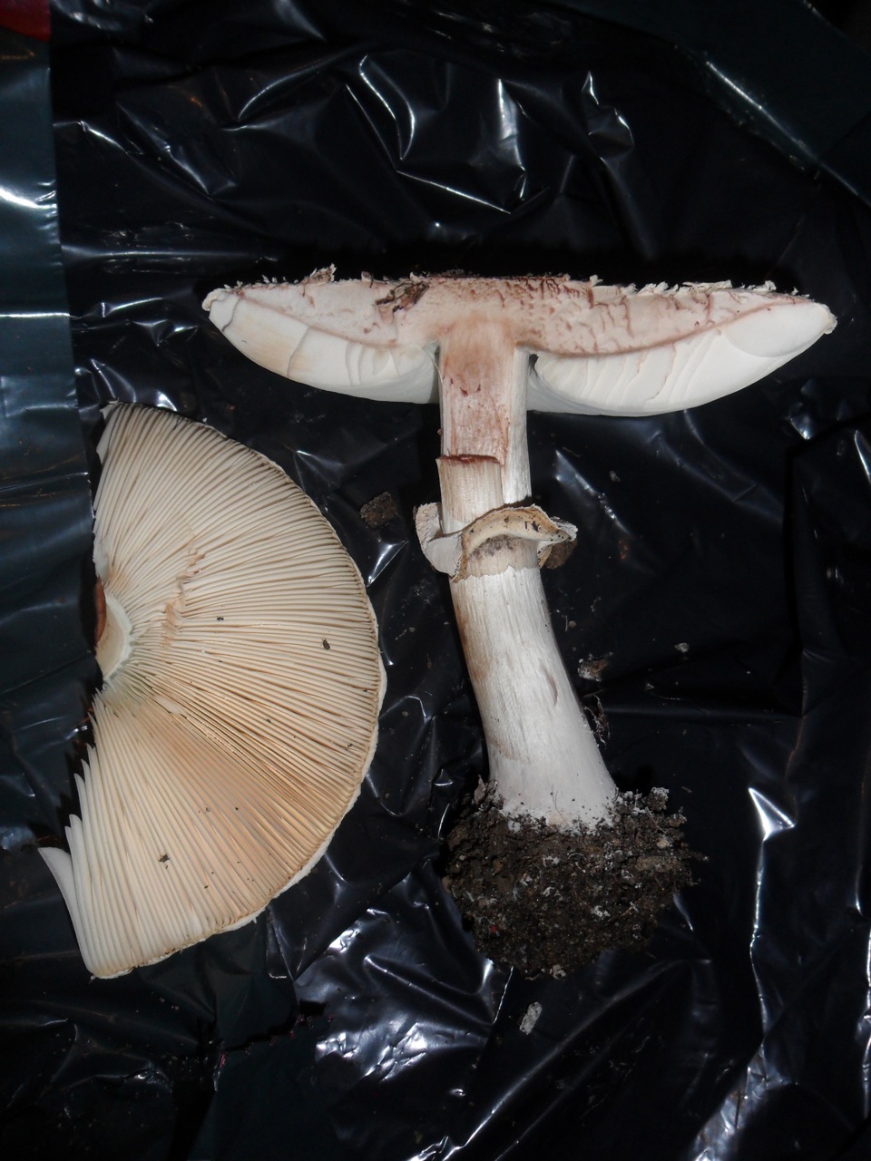 Hallo, hier ein weiteres Bild des Pilzes, den ich mir inzwischen in natura ansehen konnte. Beim Anschnitt und bei Verletzung des Stieles sind mir zunächst keine Gelbtöne aufgefallen, sondern nur Rottöne (allerdings zeigt das Foto links auf den Lamellen den typischen Farbton des Safran-Schirmlings). Auffallend war beim Anschnitt eine grüne Linie zwischen Fleisch und Lamellen, die auf dem Foto am ehesten zwischen Lamellen und Stiel zu erahnen ist. Nach Entfernung der Lamellen ist dieser grüne Farbton auch deutlich zu sehen. Geruch deutlich und nicht angenehm. Erinnert mich nicht an Safran-Schirmling, auf den ich auch zuerst getippt habe. Sporenpulver weiß.