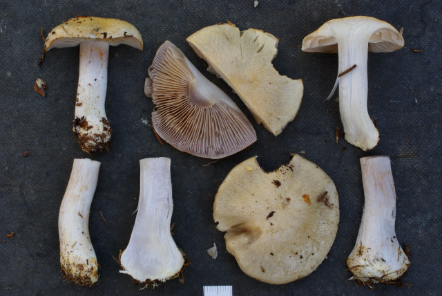 Liebe Phlegmacien-Freunde, nach dem Frust mit dem zerstörten Exsikkat (siehe voriges Posting) gleich nochmal ein Schleimkopf, diesmal mit intaktem Beleg und mit Namen. Kurzbeschreibung: Hut anfangs mit kaum wahrnehmbarem Blau-Stich, bald sehr blass ockerlich oder grau-ockerlich, eingewachsen faserig, schleimig; Geruch angenehm „pilzig“; Stiel und Lamellen blass violettlich, Stielbasis +- knollig oder nicht, aber nicht abgesetzt oder gerandet; Huthaut deutlich bitter; Sporen ziemlich rau-warzig, klein, nur bis ca. 8 µm;